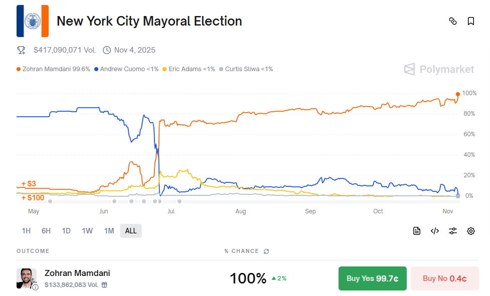 (Polymarket显示纽约市长竞选的总下注金额已高达4.17亿美元)